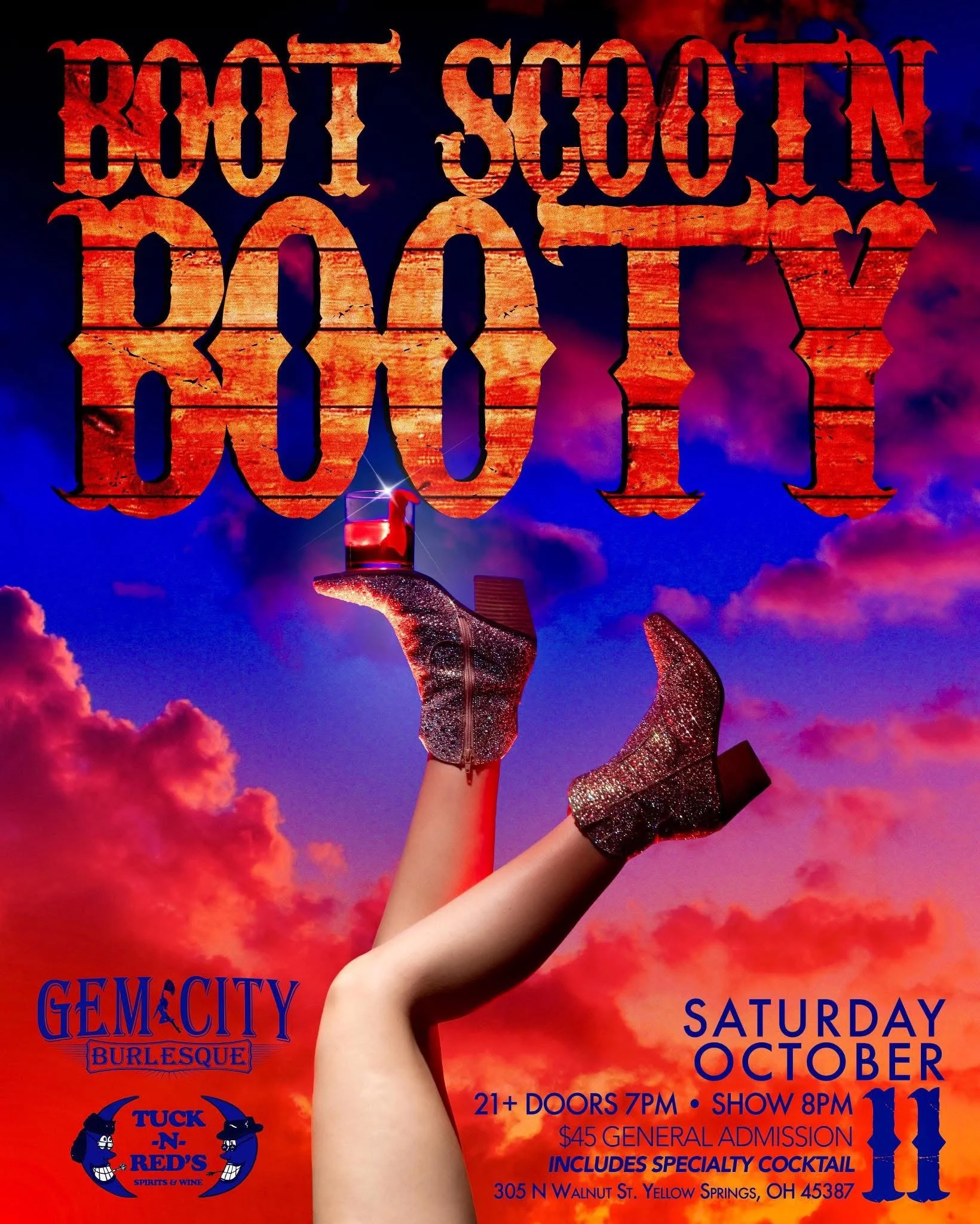 Boot Scootin' Booty Saturday, October 11, 2025 7:00 PM 11:00 PM 19:00 23:00 Tuck-N-Red's Yellow Springs (map) Google Calendar ICS Throw on your best Cowboy hat and reserve your seat for an intimate stage show featuring burlesque and pole performances in Yellow Springs!A single ticket includes a complimentary beverage of your choice!Ages 21+Doors: 7pmShow: 8pmTickets here